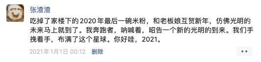 想起了去年的这个时候发的朋友圈:我奔跑者,呐喊着,昭告一个新的光明的到来。我们手挽着手,布满了这个星球。你好哇,2021。